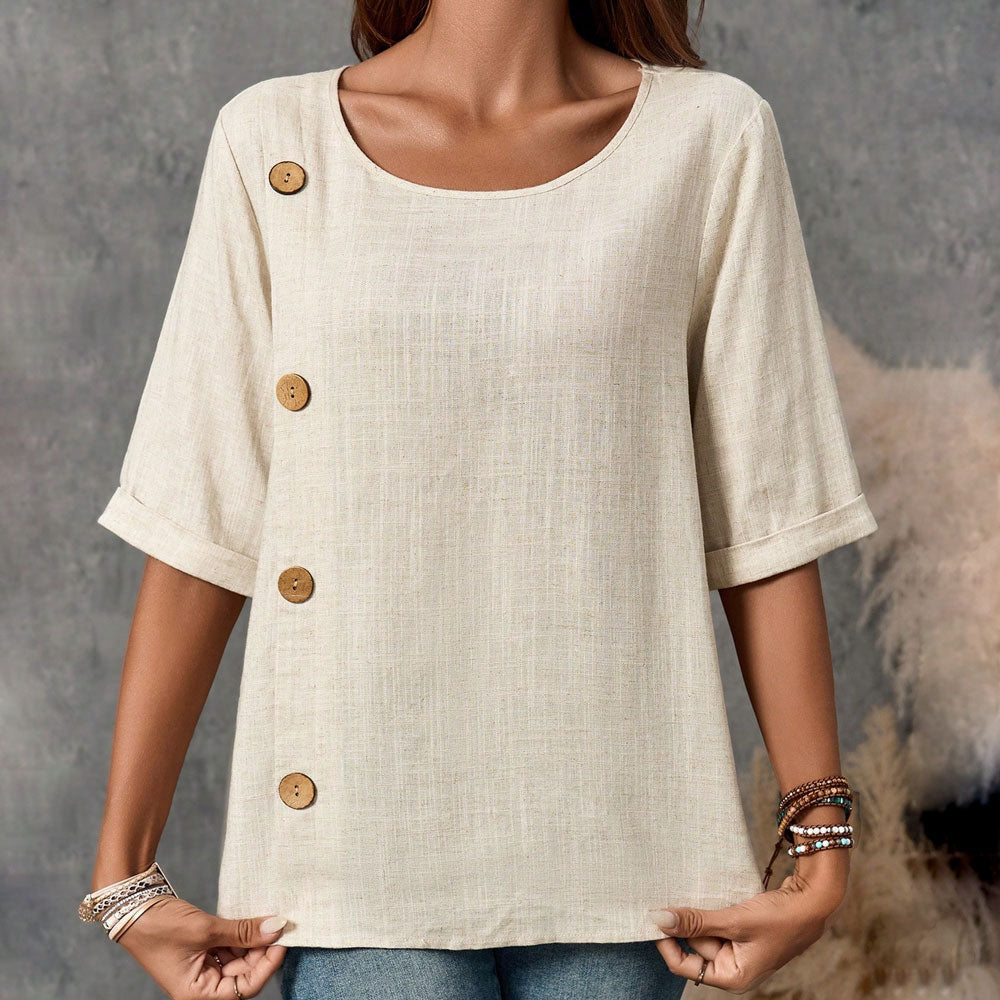 Quand il fait chaud, chaque matière compte. Ce top 100 % esprit lin laisse l’air circuler et vous garde fraîche du matin au soir. Contrairement aux tissus synthétiques, il ne colle pas à la peau. Il vous accompagne avec légèreté sans jamais vous alourdir.