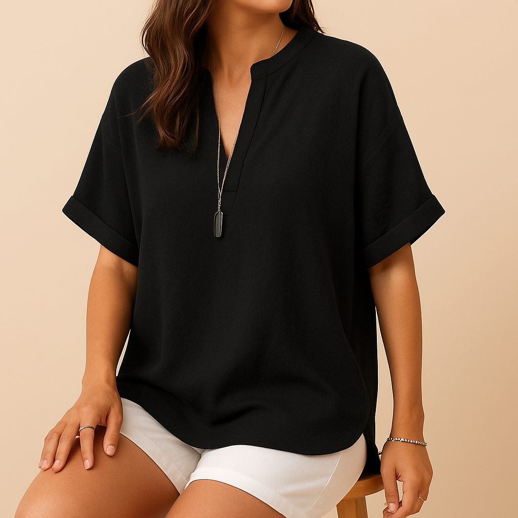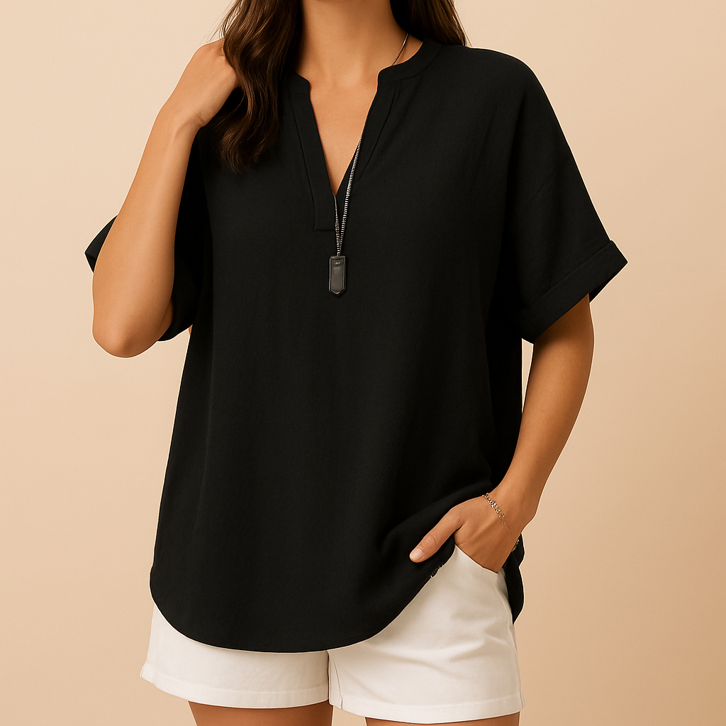 Avec son col V élégant et sa coupe loose, ce top noir minimaliste s’associe facilement à un jean, une jupe ou un short, pour un style chic sans effort.