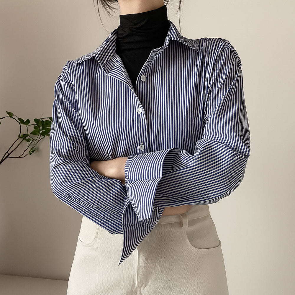 En plus d’être intemporelles, les fines rayures bleu marine allongent visuellement. Portée rentrée ou laissée fluide, elle affine et structure la silhouette avec sobriété.