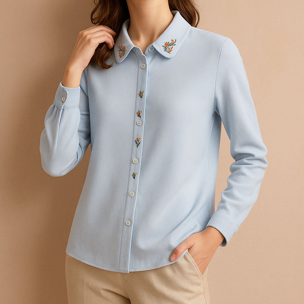Chaque broderie est délicatement posée, du col à la patte de boutonnage. C’est subtil, raffiné, et inattendu. Elle dit : "je prends soin de moi", sans jamais en faire trop.