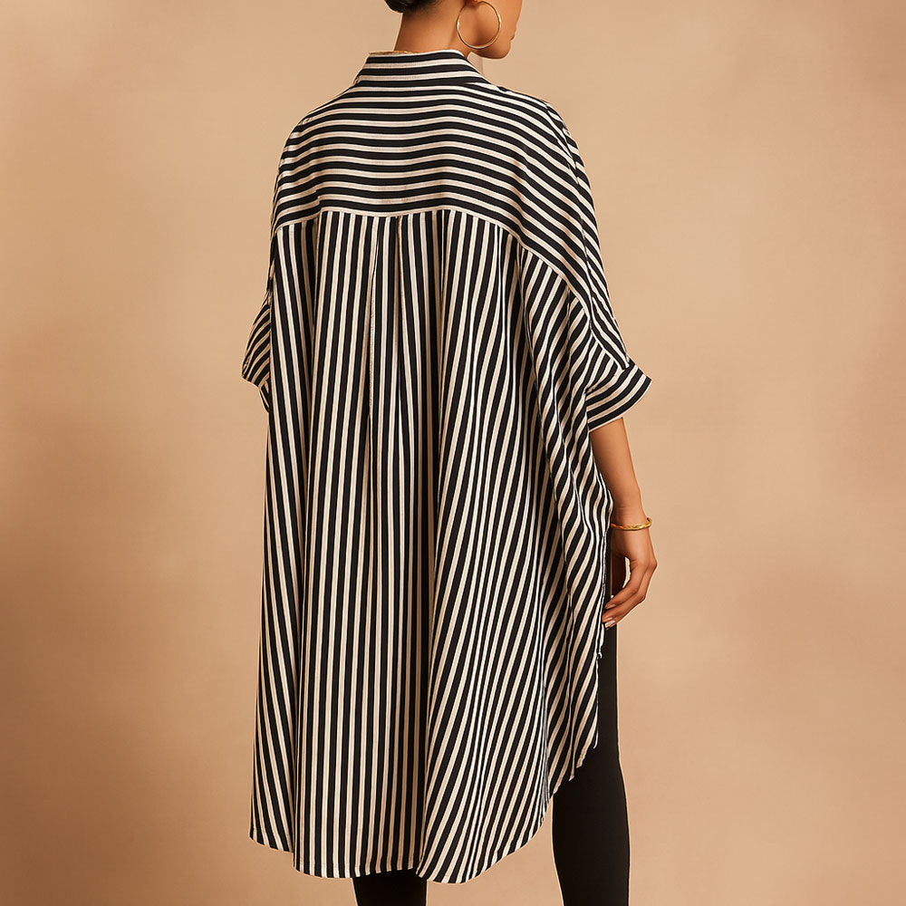 Non, justement : les rayures verticales et la coupe asymétrique créent un effet allongeant très flatteur. Elle tombe sans coller, sans alourdir.