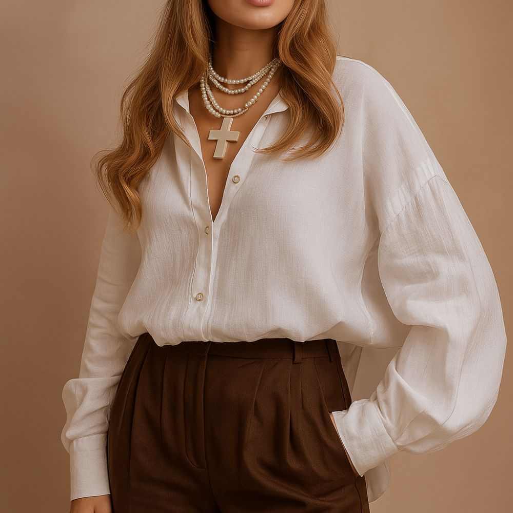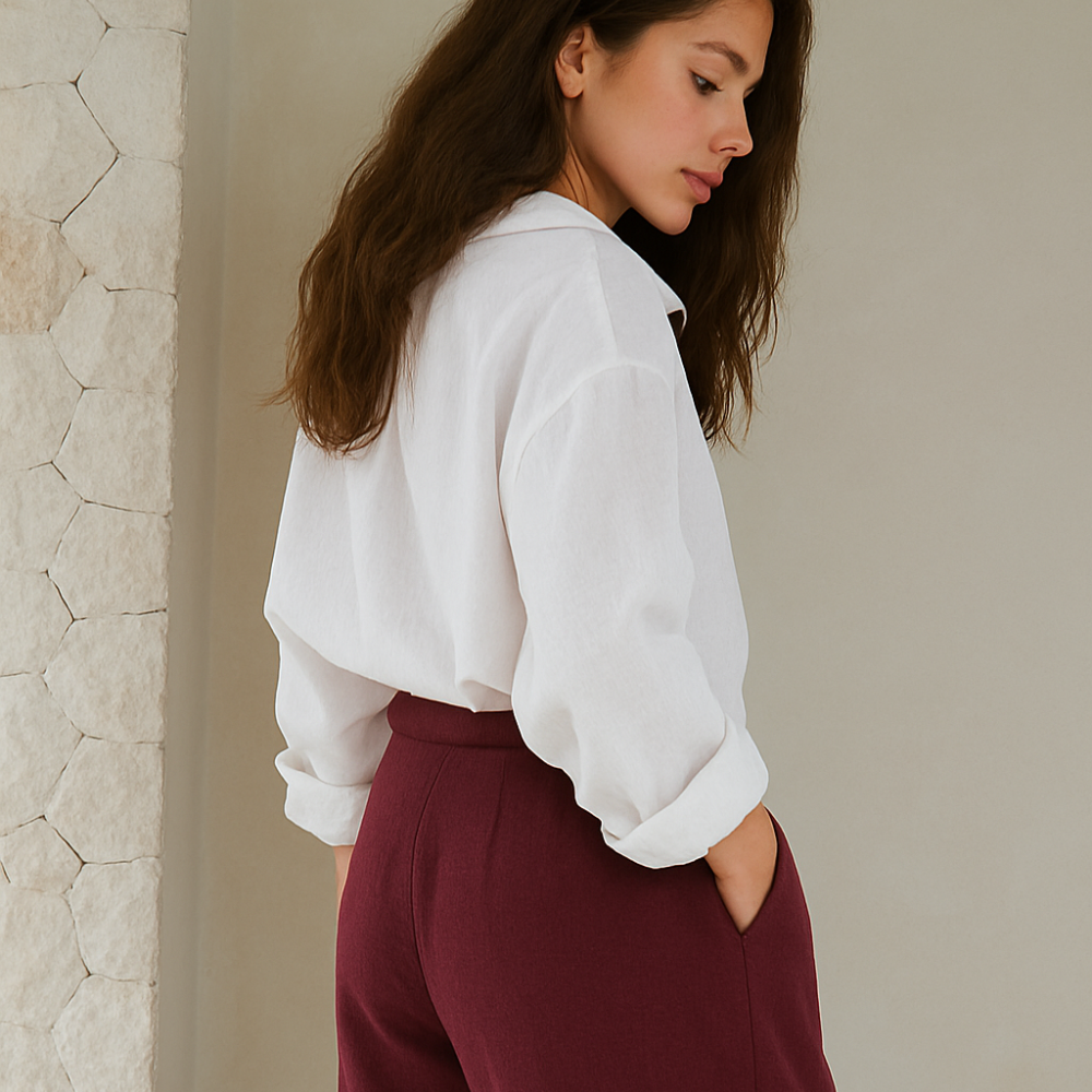Pas besoin d’en faire trop pour rayonner : cette chemise en lin blanc dit tout en silence. Sa coupe oversize soigneusement étudiée donne une allure naturelle, travaillée mais jamais rigide. C’est la pièce qui vous sauve quand vous voulez être chic, sans y passer des heures.