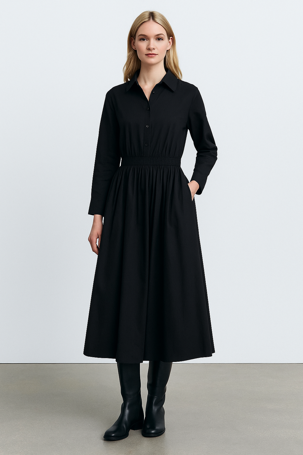 Élégante sans jamais en faire trop, cette robe est pensée pour sublimer votre allure avec simplicité. Sa coupe cintrée à la taille met en valeur votre silhouette, tandis que sa longueur mi-mollet apporte une touche résolument moderne et sophistiquée.